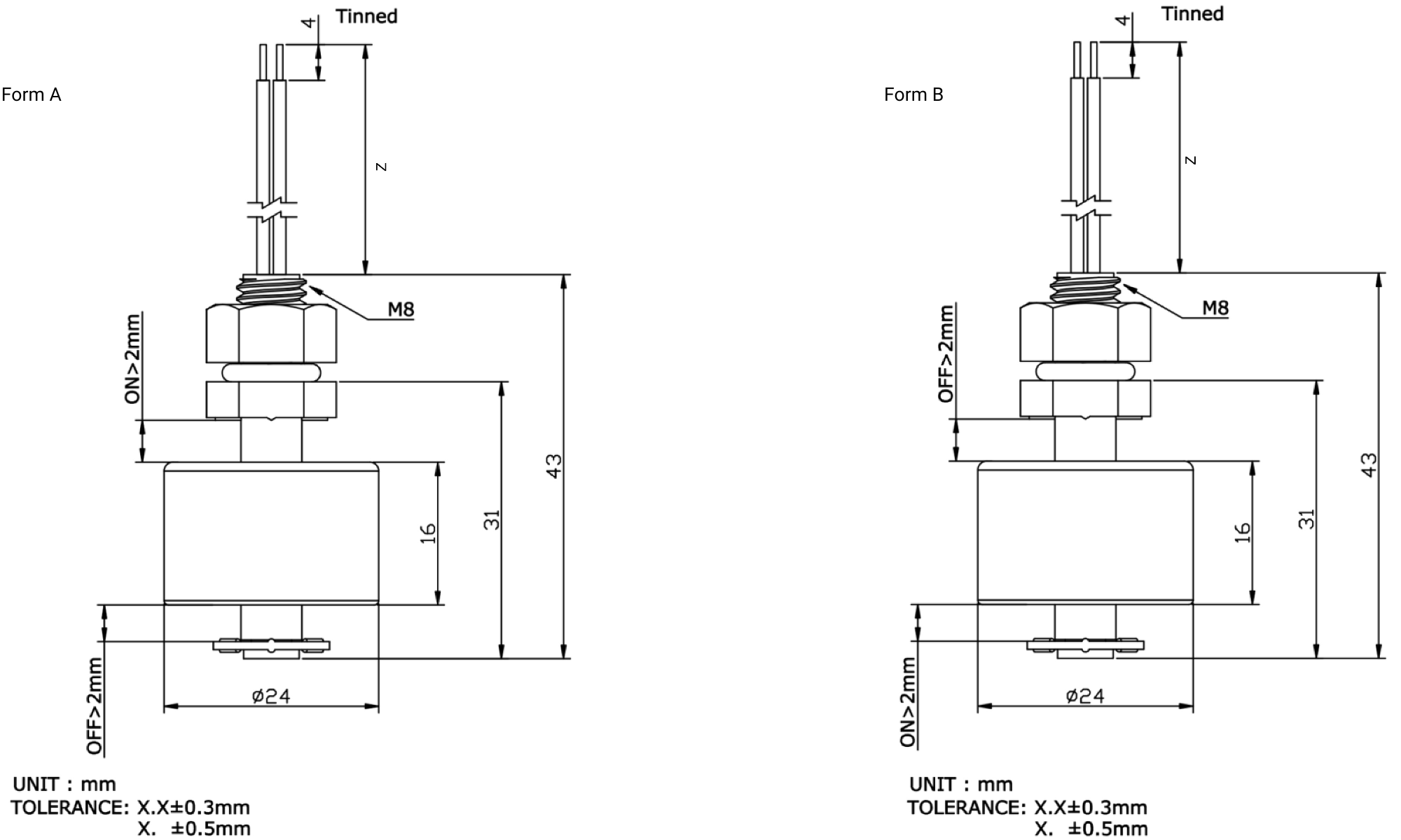 A reed-based float switch that can be configured as either normally open or normally closed. Available in different cable lengths and with various connector options, it offers flexible application possibilities for diverse uses.